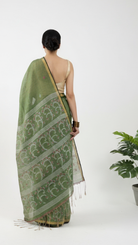 Green Handwoven Linen Tissue Saree – Palak Pallu Design