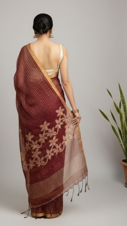 Reddish Brown Handwoven Pure Linen Saree – Checks & Floral Motifs