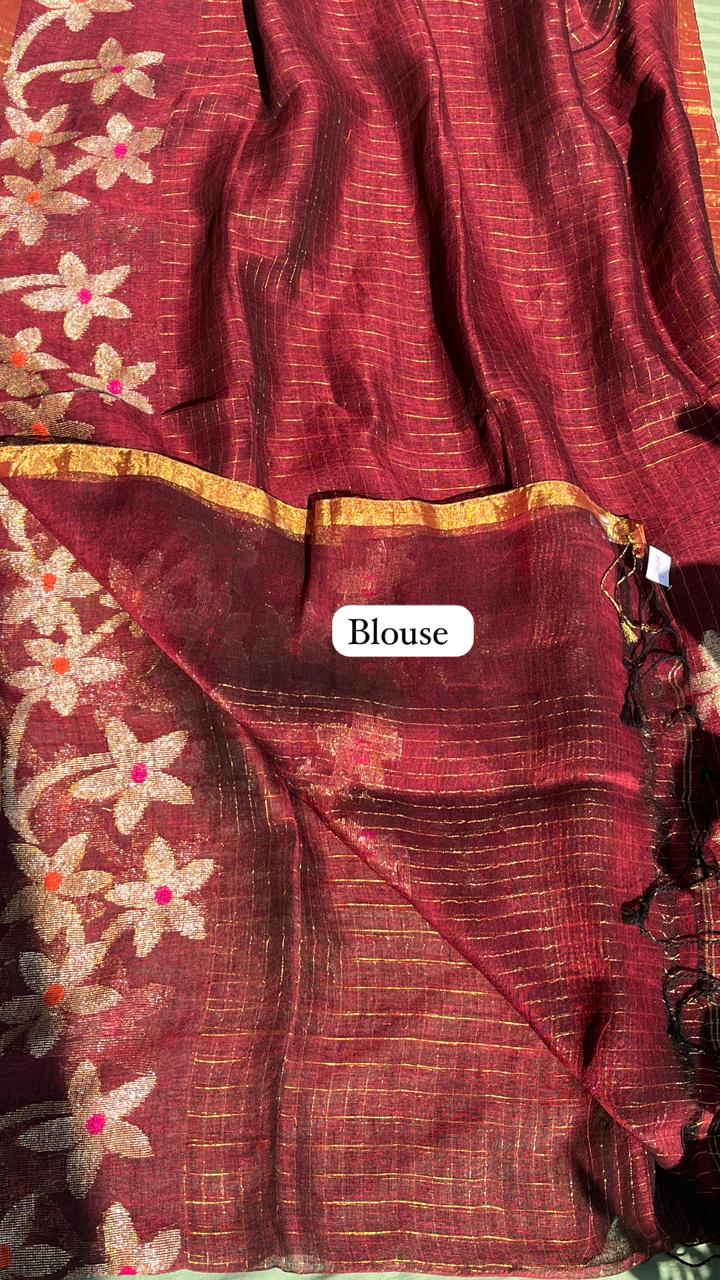 This is an exquisite pure linen saree features delicate zari checks intricately woven with a handwoven floral design.